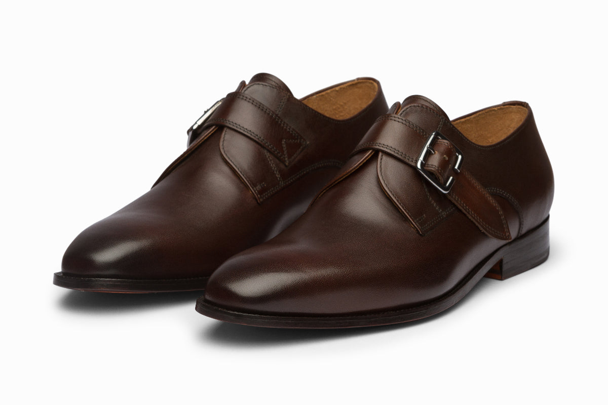 Leather Single Monk, Hand Built Argentinean Natural Edge Leather Sole, Dark Brown Calfskin Leather Uppers, and Rich Tan Leather Lining.