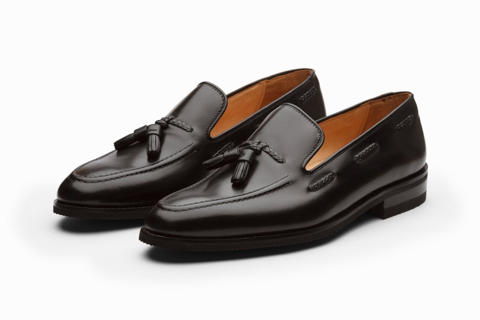 Handmade Tassel Loafer features High-Grade Rubber Sole, Black Calfskin Leather, and Rich Tan Leather Lining.
